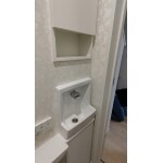 タンク付き一体型トイレを撤去し、トイレをタンクレスに、手洗器を新たに設置致しました。壁付け収納の位置を少し上に移動いたしました。