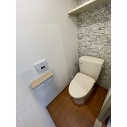 節水型トイレへ変更し、省エネ性を向上致しました。また手洗いなしタイプのタンクへ変更したことによりお掃除が楽になりました。トイレットペーパーも二つ、ミニテーブルも付きました。全面改修だったのでアクセントクロスも選定して、ダウンライトの交換や換気扇の交換も行いました。格段に快適な空間になりました。