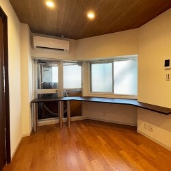窓際いっぱいにオーダーデスクを造作しました。 天井も木目調にし、落ち着いた温かい空間にしました。