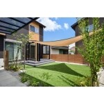 洗濯物干場には、LIXILの『ガーデンルームGF』を採用。外壁の黒と木調の色合いが、このGFのブラック×チェリーウッドのお色味にぴったりです!今回は前面と右側面を折り戸にし、お庭への出入りができるようにしています。左側面は出入りも少ないため、腰パネルの仕様に。内部日除けも取り付けたので、暑い日の日差しコントロールも可能です。三角形のシェードはタカショーの『シェードセイル』1辺5mもある大きな日よけです。GFの中でくつろぐのもよし、人工芝の上で日陰でごろごろするのもよし、植栽を楽しむのもよし!なガーデンが出来ました。日よけがあればお庭に出ることが増え、人工芝は歩くのも楽で、家の中からの眺めも緑が増えて癒されます。門周りはグレーのジョリパッド仕上げに真鍮のライトをアクセントにしています。ポストはインスタでも人気のボビポストを採用。オリーブ色が優しい色でかわいいですね。既存の駐車場土間にはブラックのカーポートをつけました。門塀の奥には角柱を建ててガーデンルームの軽い目隠しになるようにしました。
