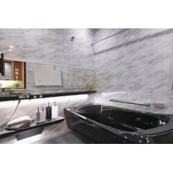 今回は艶感を気に入っていただき大理石の質感が楽しめる「アジャックホワイト」を選んでいます。大理石調の壁はラグジュアリーを演出し浴槽のブラックが重厚感とシックで落ち着いた雰囲気を醸し出しています。