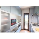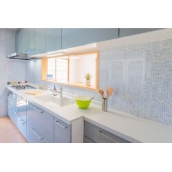 器具は、TOTOシステムキッチン ミッテをご採用いただきました。お客さまがこだわってお選びいただいた面材のカラーに合わせて、タイル調のキッチンパネルをご提案しました。 キッチンパネルは壁仕上げ材のひとつで耐火性が高く、デザインやカラーも豊富です。また、汚れや水ハネにも強いため、簡単なお手入れで清潔を保つことができます。 タイル調パネルが空間に彩を添えて、爽やかなキッチンへと変わり、お客さまにご満足いただくことができました。