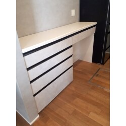 カップボードをジャストサイズで設置して収納をスッキリ見せます。