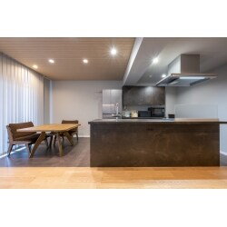 キッチンは重厚感のある「グラフテクト」、フローリングは無垢材のもを入れたい。また、天井も板張りにしておしゃれな空間にしたい等のご要望を頂きました。