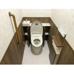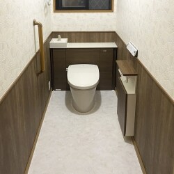 手洗いと収納を一体化したシステムトイレ「リフォレ」(LIXIL)がお勧めです。 経年劣化した埋め込み式の紙巻き器付き収納棚も交換し、収納棚の扉の色をクリエモカで揃えることで統一感が出ます。 壁のクロスも、腰壁のようにデザインして同系色に揃えることで、統制のとれたお洒落なデザインのレストルームになりますよ。 タンクは無いように見えますが、便器背面の棚に収まっており、災害時にはバケツで水を入れて流すことも可能です。