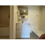 ミラーキャビネットとアクセントクロスでお洒落な洗面に