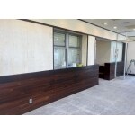 壁紙はアクセントクロスで受付カウンターが目立つような工夫をしました。 木材やカウンターをウォールナット色で流石のスタイルに仕上げました。