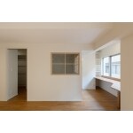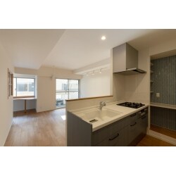 ・空き家状態が続き老朽化が進んでいたため、見た目も機能面も改善できるよう検討を重ねました。将来的に賃貸物件として貸し出す可能性があると伺い、デザイン性は高めつつ、ユニバーサルに活用しやすい間取りをご提案しました。 ・対面キッチンをご希望でしたので、現地調査で腰壁カウンターの下に給排水の配管を通せば可能であることを確認。「以前、無理だと言われてあきらめていたので嬉しい」と喜んでいただけました。 ・レンジフードのダクト配管を梁に沿わすなど、凹凸の少ないシンプルな天井になるよう配慮しました。一方、エアコンの配管は賃貸として貸し出した際に交換がしやすいようあえて露出させたうえで、すっきりとした見た目となるよう配管ルートを工夫しています。