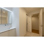収納たっぷり、ホワイトウッドの清潔感ある洗面化粧台