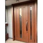LIXILのリシェントという玄関ドアをご提案させていただきました。交換用の玄関ドアとして開発され、改良が進み、今や3代目の製品です。 施工性・納まりも非常に良く、1日での施工が可能です。 カラーやデザインも、近年各種建材でトレンドの「木目」の強い物を取り入れています。 ハンドルはブラックで、こういったテイストは建具やキッチン、収納建材などでも人気があります。