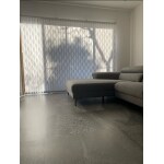 床は東リのロイヤルストーンというフロアタイルを既存のフローリングの上に施工しました。とても高級感のある仕上がりです。 また、明るい雰囲気に仕上げるために、カーテンをTOSOのデュアルシェイプという波型バーチカルブラインドに変更。日の入り加減で影もとてもきれいに映ります。