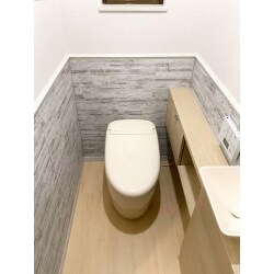509.木目調のフロアとアクセントクロスがオシャレなトイレ。