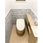 ショールームにお越しいただいた施主様。そこで元々希望していたトイレと化粧洗面台を見学されました。 希望の商品をベースに使い勝手や衛生面を考え、施主様お好みの柔らかい雰囲気の空間になるように内装をご提案。 トイレの壁には、清潔感溢れる白をベースに腰高の壁は抗菌・抗ウイルス・防臭効果の高い、ハイドロセラ・ウォールのグレーの積み石柄を。 キャビネットやカウンターは木目柄のベージュ。 洗面台は浴室の雰囲気に合わせてこちらも木目柄の明るいベージュを。 水廻りがとてもナチュラルで落ち着く空間に仕上がりました。
