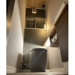 トイレの色ノーブルグレーに合わせ、色使いと素材感を感じられる空間をコンセプトに。 無垢材の造作カウンターや間接照明、床もフロアタイルに。 ご自身で購入できる商品なども使い、コスト面も相談しながらご提案させていただきました。