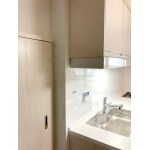 ・キッチンは食洗機をシンク下に設置出来るタカラスタンダードを提案。 吊戸下にアイラックを設置して以前と同じ使い勝手を考慮、小物類は全て収納できるようにしました。 ・管理組合承認の上、給湯器をベランダに移設しました。 移設後のスペースには配管修繕等のために下部に点検口を備えたニッチを造作。 中央部に可動台タイプの収納、上部は換気ダクトスペースになっています。 ・旧給湯器裏にある立管を避ける為、キッチン正面の壁を造作。 タカラスタンダードのホーローパネルでマグネット類も取付けられて、ほぼお手入れフリーです。 ・ドアを引戸にする際、引戸の引き込みスペースが無かった為、袖壁を造作しました。