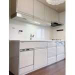 シンク下に食洗機を設置し、シンクを左寄せにする事で調理スペースを最大に確保しました。 吊戸下にはアイラックを3列設置して、小物類は全て収納しました。