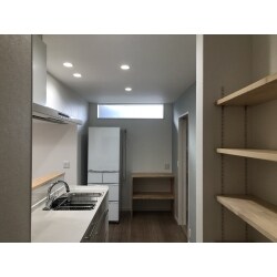キッチンは以前の壁付けタイプから対面タイプにされたいとの事でしたが、調理の様子など見えすぎるのも気になるとの事で半分だけ見えるような設計にしました。 またキッチンの横にはたっぷりの収納棚を設置。物がすぐに取りに行けるので家事も楽になります。