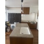 以前は、センターキッチンの横にI型キッチンがありました。センターキッチンはアイランドで明るいマーブルの人造大理石カウンターでした。
