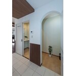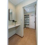 ご家族が多い為、洗面室は脱衣室と別にスペースを確保するプランをご提案しました。洗面化粧台背面には、メイクカウンターを設け、ご家族が混雑する時間帯の身支度もストレスなく行うことができます。出入口の開口は、R加工を施し、床のフロアタイルもキッチンと分けることで別空間となりました。(※洗面化粧台は既存利用)