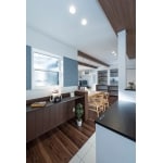 回遊できる便利な動線になるようキッチンをご提案しました。LDKを一部増築したことで、開放感のあるオープンなキッチンになりました。 背面は、カップボードに加えて増築して広くなった分、奥様ご希望のパントリーを設けて収納を充実させました。 キッチンとLDは床を貼り分けフロアタイルを施工。天井は、長手に沿って天井を下げてLDK空間のアクセントとしました。キッチン扉のブルーグレーのカラーをLDK空間の各所に取り入れて、統一感を持たせました。