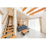 ・リビングに吹き抜けを採用 ・LDKとウッドデッキの床を同じ高さとし、LDKとウッドデッキがひと続きのリビング空間となる ・LDK及び玄関ホールの壁に調湿効果のある漆喰を使用 ・床は無垢フローリングを使用 ・吹き抜け部分は将来、個室として改修可能