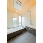 明るく広々とした浴室。 天井付のベース照明の他にアクセント照明を設置。 夜間はアクセント照明だけを使用すると、落ち着いた空間へと変化。ゆっくり、ゆったりお風呂時間を楽しめます。