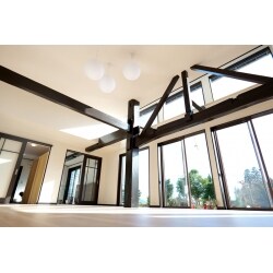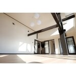 約18帖の広いリビングで上部は吹抜。既存の柱や梁などを活かしながら補強や梁の架け替え等をし、表しにして空間のアクセントになっています。