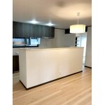 リビングとは建具で区分けしましたが、FIX窓を配置するなどして明り取りとするなど可能な限り配慮しました。システムキッチンの背面に作業台を配置し、家電をおいても家電の背面が見えないように腰壁を造作。ダイニング側に収納棚を造作し、キッチンに納まりきらない収納物の置場を確保しました。