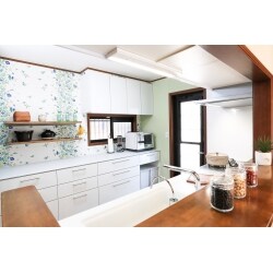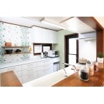 キッチン後ろ側の壁はアクセントに北欧風クロスを貼り、造作棚を設置。 造作には、サンプルを取り寄せて材質の確認をしたり、棚の取付け位置をミリ単位で調整するなど、 お客さまのご希望に添うよう何度も打合せを重ねました。 白を基調とした中に、カラフルな色どりと木目の風合いを取り入れ、明るさとぬくもりを感じるナチュラルな空間に。 まるで小鳥のさえずりが聞こえてきそうなさわやかなキッチンへと生まれ変わりました。