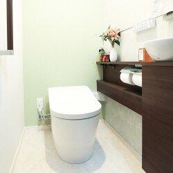 器具はTOTOの新商品である「ネオレストLS」をご採用いただきました。 ネオレストLSは、清潔・きれいの機能はもちろんのこと、デザインの美しさも大きな魅力のひとつです。 タンクレス便器と家具のようなキャビネット・二段カウンターで、スッキリとした空間を実現することができます。 キャビネットのカラーは既存の建具・家具との色合いを調和させるダルブラウンを、壁紙は奥様お好みのグリーンをメインに選定を行いました。 ブラウンとグリーンからなる落ち着きある中にもすっきりとした爽やかさを感じる空間に、意匠性のあるデザインの便器が備えられ、より一層、上質で華やかな空間へと生まれ変わりました。