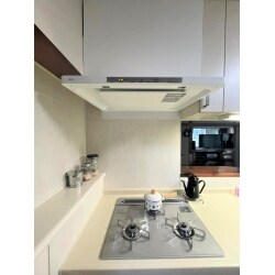 コンロが古くなりいたんできたので交換しました。 旦那様が背が高く、レンジフードを出来るだけ高い位置にしたいとご希望があったので、 5cmくらい高くなるように調整して取付けたのもポイントです!