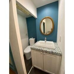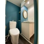 色々とお話をする中で、洗面空間とトイレ空間を繋げる形のアメリカンスタイルに落ち着きました。 これにより、開放感を感じられる空間を実現しました。 洗面台については色々とご提案していく中で、ウッドワンのタイル天板の洗面を気に入って頂き、納品させて頂きました。 当初のお客様の計画では60cmの洗面台しか入らないところ、一緒に計画を考えていく中で、75cmの洗面台を設置することができるプランに辿り着き、大変喜んで頂きました。