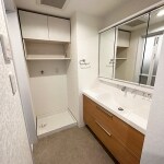 オーダーサイズのトールキャビネットで収納力を向上させました。また、片扉をミラー扉にすることにより、実用性と空間を広く見せるよう工夫しました。