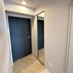 オーダーサイズでトールキャビネットで収納力を向上させました。また、片扉をミラー扉にすることにより、実用性と空間を広く見せるよう工夫しました。