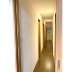 キッチンダイニングから床の高さが一定で、部屋に入るためのドアなどはなるべく一直線にしたため、廊下がすっきり見えるようになりました。また、照明を多くしたことで夜でも明るい廊下に仕上がっております。