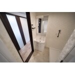 クラッシュグラス柄が映えるリゾートホテル風サニタリールーム