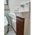 省エネ達成率100%以上のタンクレスへ変更したいとの事でしたので、手洗い一体型の製品をご提案しました。 クロス、床CF、収納キャビネットのお色は、毎日使用されるお客様ご自身で選んでいただく事にいたしました。