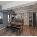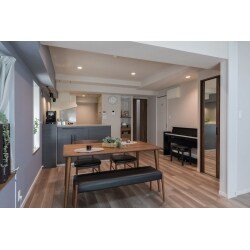 築33年のマンションを全面改修。ご家族がこれからの暮らしを快適に過ごせる住まいをご提案させていただきました。玄関から続く長い廊下のスペースを取り込み、広くなったリビングダイニング。 家族でくつろげるゆとりのあるリビングダイニング空間が広がり、キッチンと洗面の動線も改善されました。また、キッチンをL型からI型に変更し、ダイニング側にハイカウンターを設置。作業スペースが広くなり、収納量を確保しながらキッチンの足元を隠せる、奥さまに嬉しいレイアウトになりました。 リビングに隣接していた和室は洋室へ変更し、お子様が小さいうちはプレイルームに。また机を並べて置けるようプランニングしたので、将来は学習スペースとして、お子様の成長とともに変化が可能です。 H様ご家族の暮らしやすいアイデアが詰まったお家。家族の時間を大切にしながら、これからも楽しみなお住まいが完成しました。