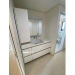2人で同時に鏡を使うことができる、トクラスの洗面台、エポックを採用。5面鏡としても使うことができる、使い勝手の良い洗面台です。 また収納についても洗面台のオプションにて設置。統一感も出て、収納力もある洗面空間が実現しました。