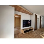 キッチンの前には造作の収納を設置。 構造上抜けない柱をダイノックシートで仕上げ、柱を挟んで、2パターンの収納を設置しました。