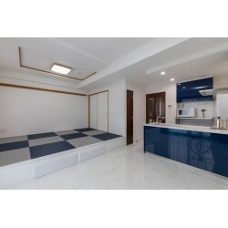 元々ある小上がりの和室は、間仕切り壁を撤去してLDKと一体感のある開放的な空間に生まれ変わりました。お食事やくつろぎのスペースとしてご夫妻の暮らしに合わせたフレキシブルな和室。個性的でおしゃれなインディゴの琉球畳と、藍色のキッチンがコーディネートされ、居心地のよい和モダンな空間が完成しました。