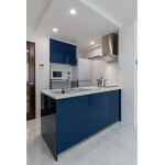 藍色のキッチンと大理石調のフローリングで上質な空間が広がります。