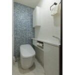 トイレはリクシルの「サティスGタイプリトイレ」をご選択されたS様。タンクレスですっきりとした空間に、名古屋モザイクの「パヴェモザイク」の美しいタイルが印象的です。