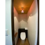 トイレは収納力の高いLIXILのリフォレを採用。照明は奥様お手製のステンドグラス照明で、様々な電球の明かりが楽しめるようになりました。
