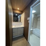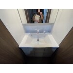 大きな鏡が使いやすそうですが収納力は少ない洗面でした。また収納が壁にあり、やや使いづらそうです。