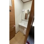わずかながら、洗面化粧台エリアから奥の脱衣場エリアに入るところに扉木枠の分、段差があります。施工後の写真をご確認いただければわかりますが、段差が解消しております。