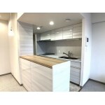 壁の一部を無くしてカウンター収納にしたことで明るいキッチンになりました。キッチンの隣にユーティリティを作ったので、玄関からリビングを通らずにキッチンに行けるようになりました。