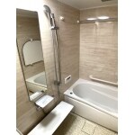 ベージュ系の色で統一された温かみのある浴室になりました。 TOTOのマンションリモデルはお掃除ラクラクほっカラリ床で入った瞬間から心地よく親水パワーで掃除が楽です。 色はビスクトラバーチンです。