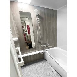 汚れにくく汚れても落としやすい高級感のある輝きが特徴の鏡面タイプのパネル、カラーは人気の高い落ち着きあるグレイッシュの木目調をご提案しました。 追い炊きができないマンション構造のため、浴槽やヒヤッとしない床で節約と同時に保温効果をアップ。 1DAY施工で疲れを癒してくれて毎日欠かせない浴室が翌日にはグレードアップして使用可能に!とても清潔感溢れる癒し空間に仕上がりました。