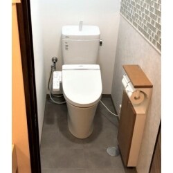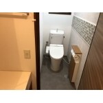 トイレの便器はLIXILトイレのアメージュへの交換をご提案しました。 手洗いがついているタイプで、トイレ内に手洗いが無いお家におすすめです。 紙巻器本体や位置を変更したり、内装工事、壁紙や床の張り替えも行うなど、ガラッと雰囲気を変えています。 壁にはガラスモザイクタイルをアクセントに使用し、落ち着いた空間に仕上がりました。